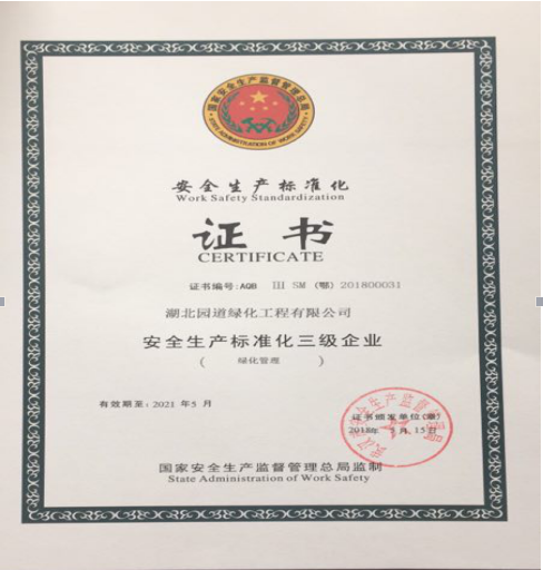 近日,湖北园道公司顺利通过武汉市三级安全生产标准化考核,被市安全生产监督管理局授予“安全生产标准化三级企业”荣誉称号。